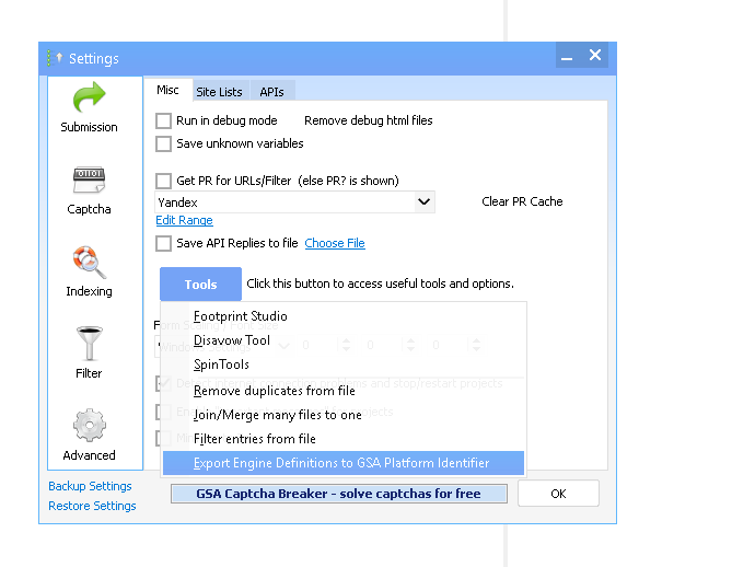 Also, make sure to export the engines from GSA SER and paste them into the engines folder of GSA PI - overwriting existing. GSA SER engines are updated more often than GSA PI, and if you use SERNUKE, their engines are not in GSA PI by default. You will find the export in GSA SER under the Advance Tab \ Misc. (See screenshot below.)