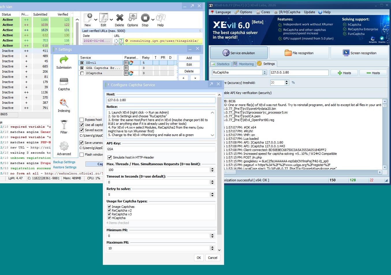 The Rcaptcha and Hcaptcha windows on the XEvil software are not working.
