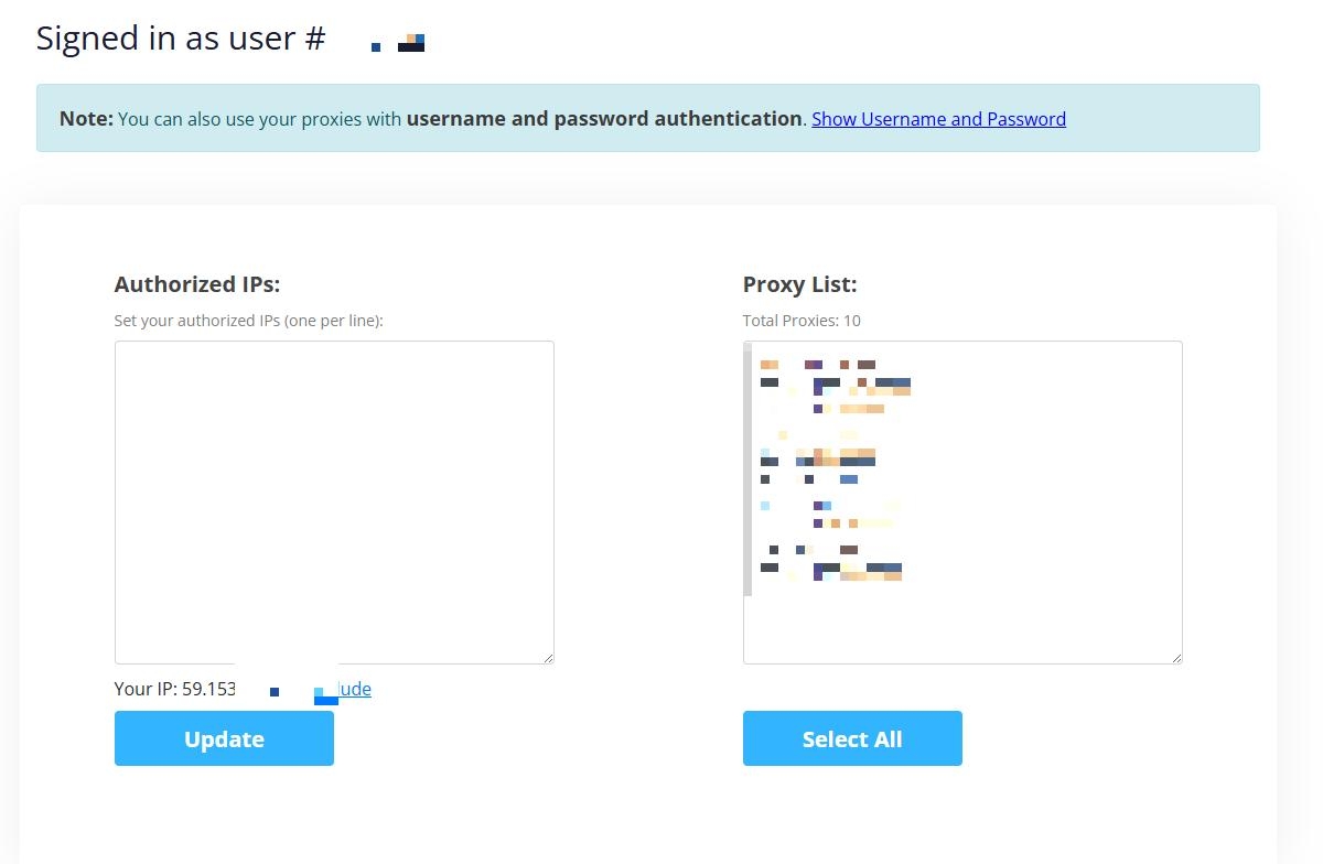 If you don't have a fix ip, meaning you are using from home, then click on the option Show Username and password --- and then you use the proxies with a username \ password on any IP